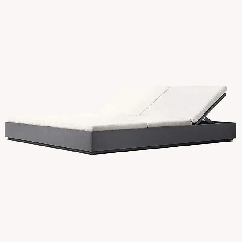 Double Chaise Lounge okkar er smíðað úr áli og er hannað til að standast veður. Hvort sem það verður fyrir rigningu, sól eða laugarvatni, helst það seigur og tæringarþolið og heldur fegurð sinni og virkni með tímanum. Dufthúðuð áferðin bætir aukalagi af vörn og tryggir að þessi legubekkur haldi ljóma sínum jafnvel við erfiðar aðstæður utandyra.
