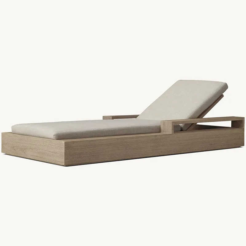 Teakviður, þekktur fyrir einstaka endingu og náttúrulega viðnám gegn veðrum, gerir hann að kjörnu efni til að búa til hágæða útihúsgögn. Sólbekkirnir okkar úr tekk með púðum eru smíðaðir til að þola mismunandi veðurskilyrði, allt frá blásandi sólinni til grenjandi rigningar, án þess að versna. Náttúruolíur í tekkviði koma í veg fyrir rakaupptöku, bægja frá meindýrum og hjálpa til við að standast rotnun, sem tryggir að sólbekkurinn þinn haldist sterkur og fallegur í gegnum árin. Með tímanum þroskast teakið og þróa með sér töfrandi silfurgráa patínu sem eykur sjarma þess og setur háþróaðan blæ á hvaða útivistarumhverfi sem er.