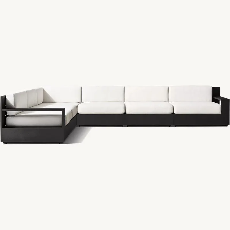 4 sæta hliðarsófinn okkar er hannaður með sterkri álgrind sem tryggir að hann standist kröfur daglegrar notkunar á sama tíma og hann heldur sléttu, glæsilegu útliti sínu. Ál, þekkt fyrir styrkleika og létta eiginleika, veitir stöðugan og endingargóðan grunn fyrir þverskurðinn. Efnið er einnig ryðþolið, sem þýðir að nýi sófinn þinn mun líta vel út ár eftir ár, sama árstíð.