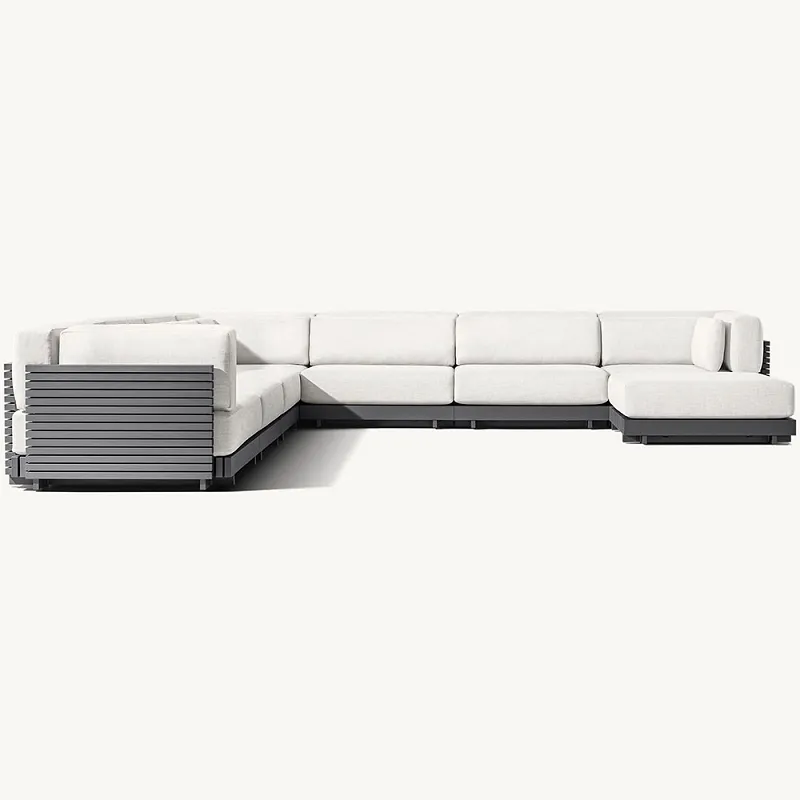 Útivistarsófinn okkar L er smíðaður til að endast, með öflugri álgrind sem býður upp á bæði styrk og glæsileika. Ál, sem er þekkt fyrir ryðþolna eiginleika, tryggir að útihúsgögnin þín þola veður og vind án þess að skemma. Þetta efni er ekki aðeins endingargott heldur einnig létt, sem gerir það auðvelt að færa og endurraða uppsetningunni eftir þörfum. Sléttur áferð álrammans bætir við nútímalegum blæ og eykur fagurfræðilega aðdráttarafl útirýmisins þíns.