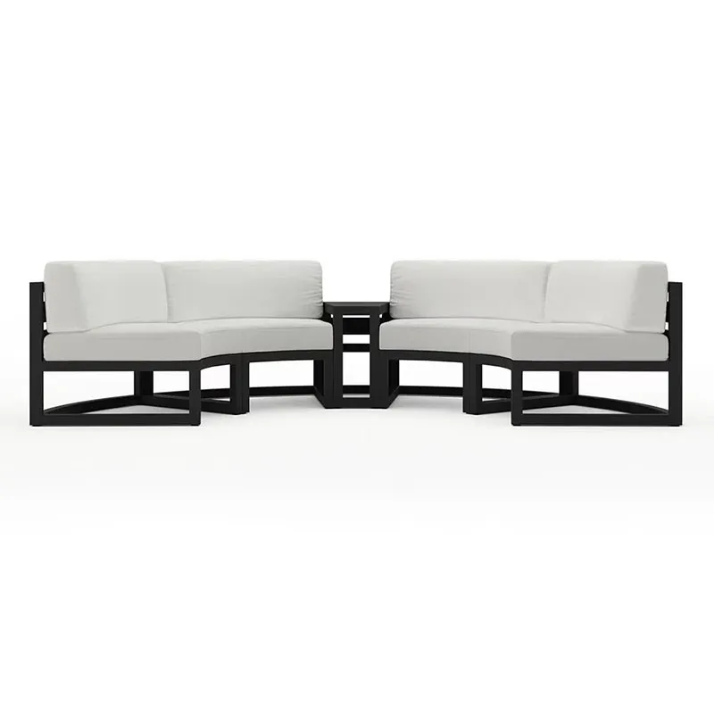 Hálf kringlótt útisófinn er búinn til úr endingargóðu áli og býður upp á langlífi og auðvelt viðhald. Þekkt fyrir styrk sinn og viðnám gegn ryð og tæringu, ál er frábært val fyrir útihúsgögn, sem tryggir að fjárfesting þín haldist í toppstandi í öllum veðurskilyrðum. Álgrindin er einnig léttur, sem gerir kleift að endurraða auðveldlega til að henta hvers kyns útisamkomu eða fagurfræðilegu vali.