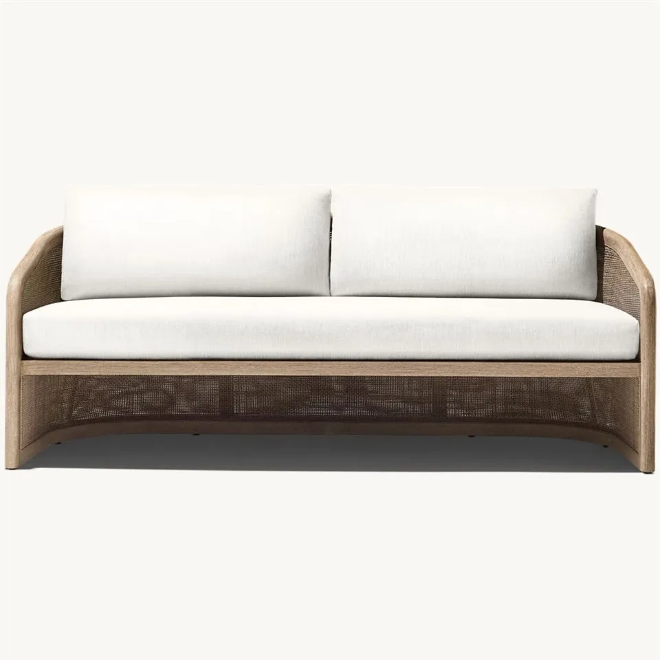 Sófinn í rattan stíl tekur umhverfisvæn efni sem kjarnann og er úr náttúrulegu rotti og tekkviði. Hann er traustur og endingargóður en gefur frá sér sterkan retro stíl. Hönnun þess leggur ekki aðeins áherslu á fegurð, heldur einnig að hagkvæmni og þægindi, sem bætir einstökum sjarma við heimilisumhverfið.